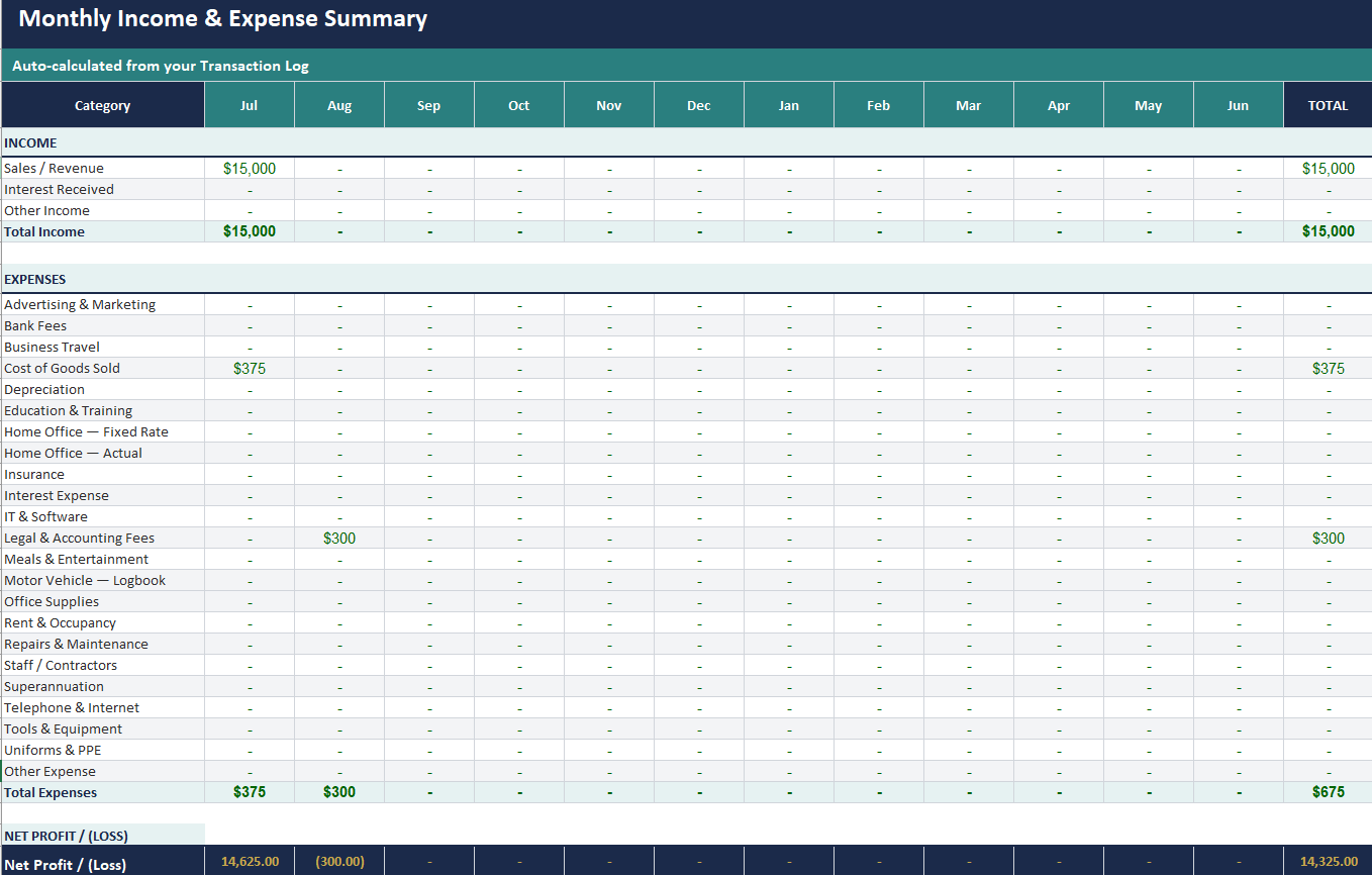 Generates a month-by-month income and expense summary across all 26 ATO-aligned categories, with no manual calculations required.